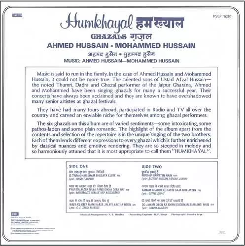 Ahmed Hussain & Mohammed Hussain – Humkhayal Ghazals – PSLP 1026 – Reprinted LP Cover Only