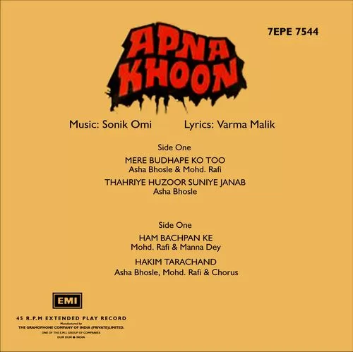 Apna Khoon – 7EPE 7544 – HMV – Cover Colour Photostate – EP Record