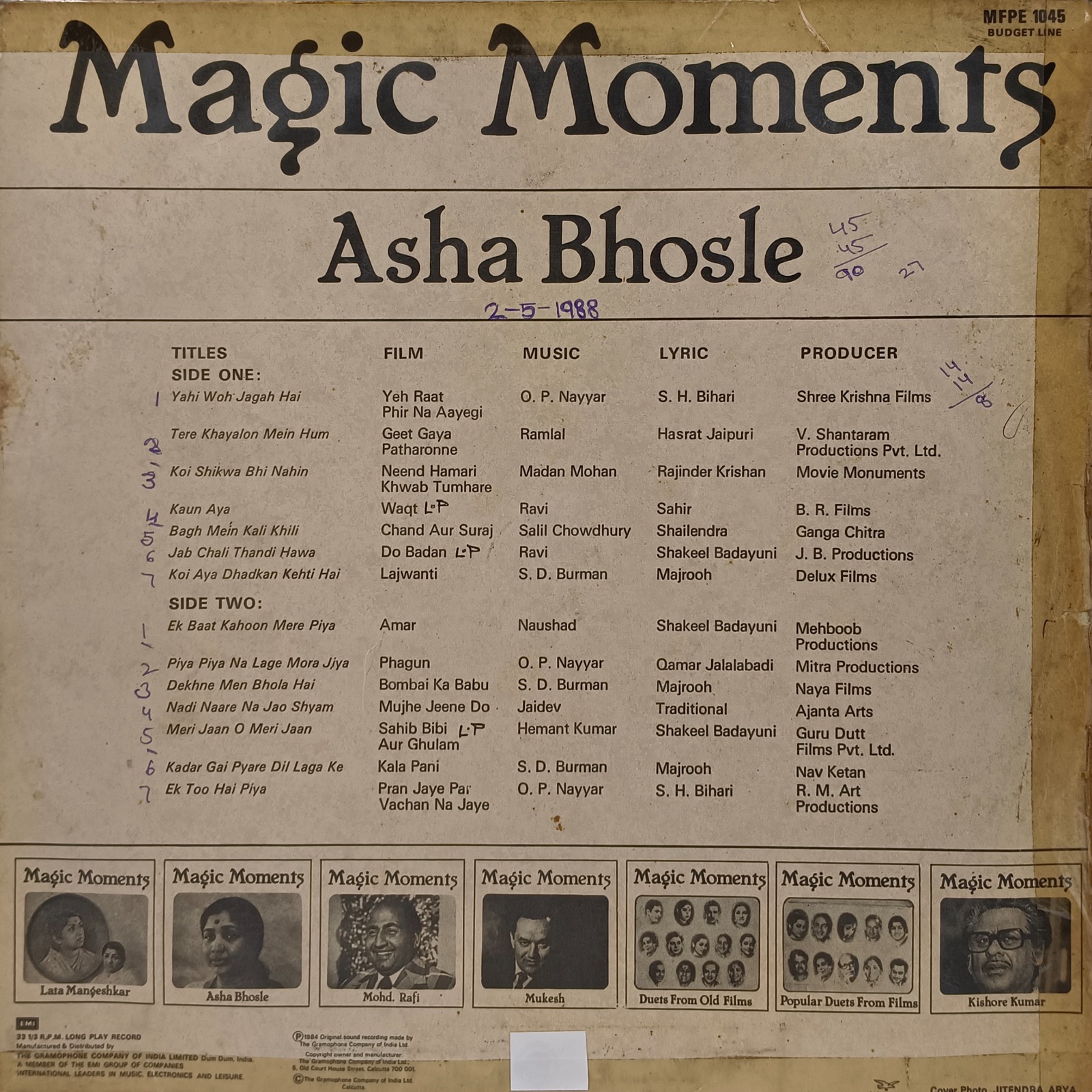 Asha Bhosle – Magic Moments – MFPE 1045 – Film Hits LP Vinyl Record