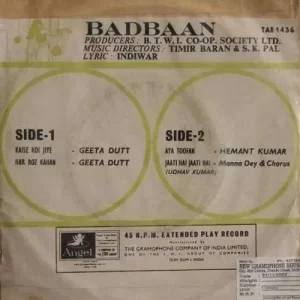 Badbaan – TAE 1436 – Odeon – (Condition – 85-90%) – EP Record