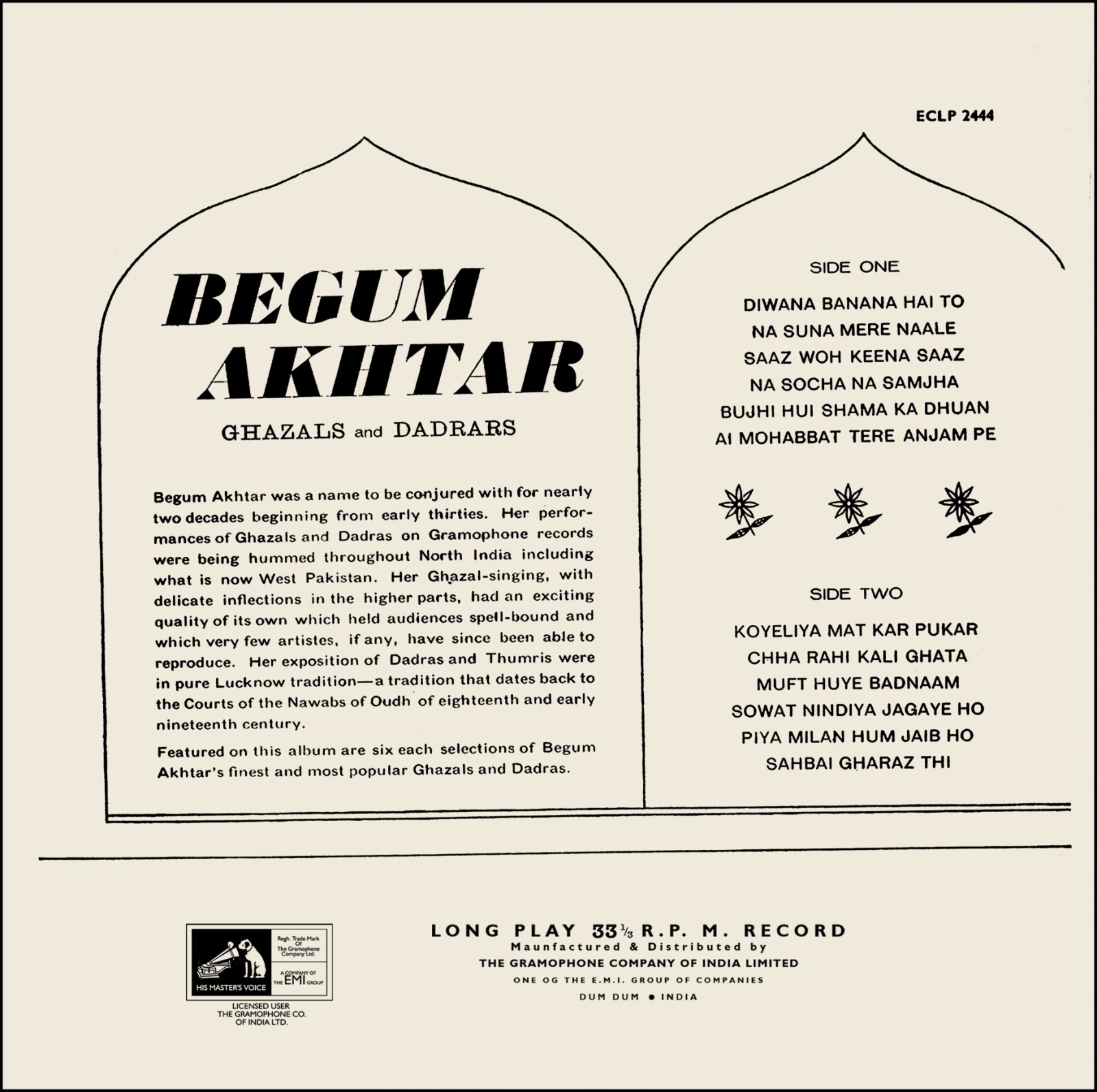 Begum Akhtar – ECLP 2444 – (90-95%) – CR – HCL – Ghazal’s LP Vinyl Record