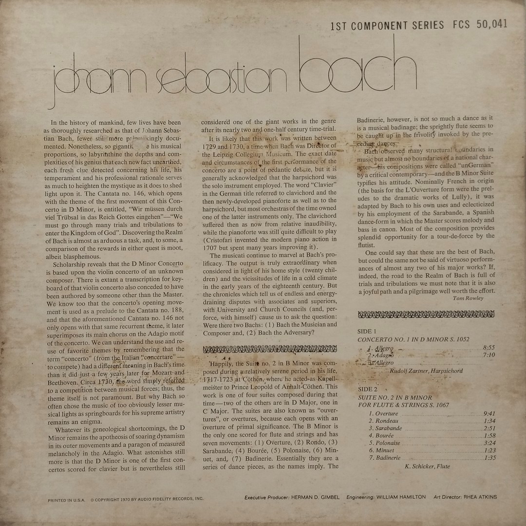 | Johann Sebastian Bach – FCS-50041 is a vintage classical LP release featuring Bach’s orchestral works, most notably the Harpsichord Concerto No. 1 in D minor (BWV 1052). | |