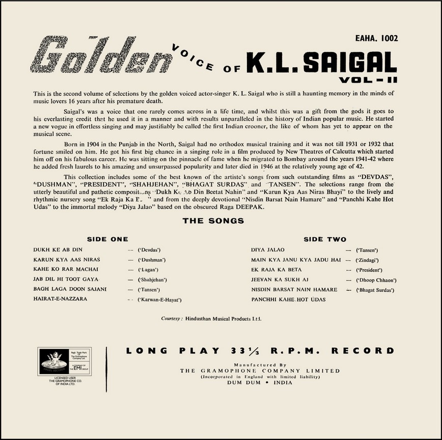 | Title | K. L. Saigal – The Golden Voice Of – Vol. 2 – EAHA 1002 |