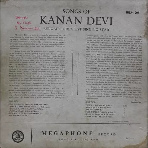 Kanan Devi – Songs Of Kanan Devi – Bengal’s Greatest Singing Star – JNLX 1007 – (Condition 90-95%) – LP Record