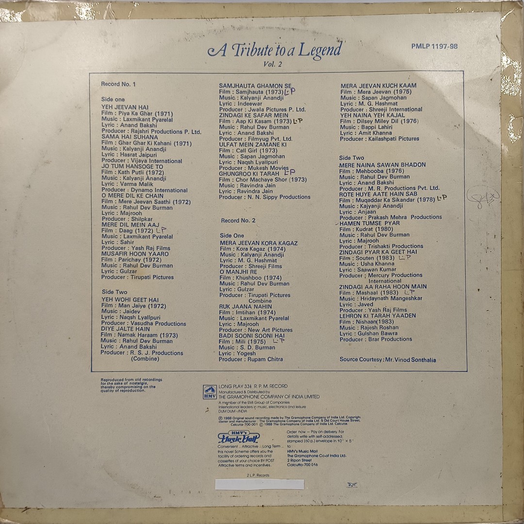 Kishore Kumar – A Tribute To A Legend Vol. 2 – PMLP 1197-98 – Film Hits 2LP Set Vinyl