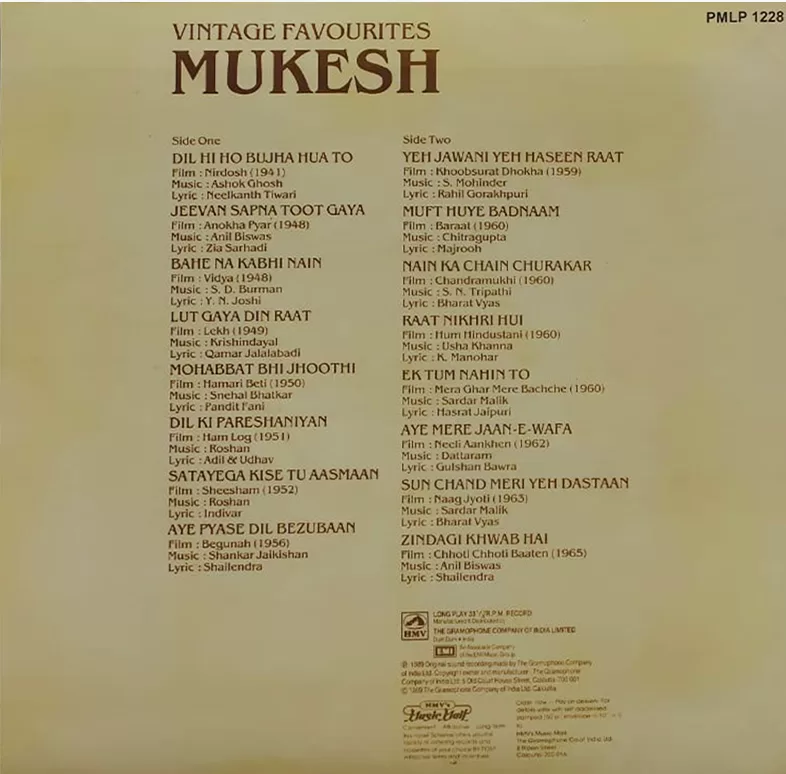 Mukesh – Vintage Favourites – PMLP 1228 – (Condition 90-95%) – Cover Reprinted – LP Record