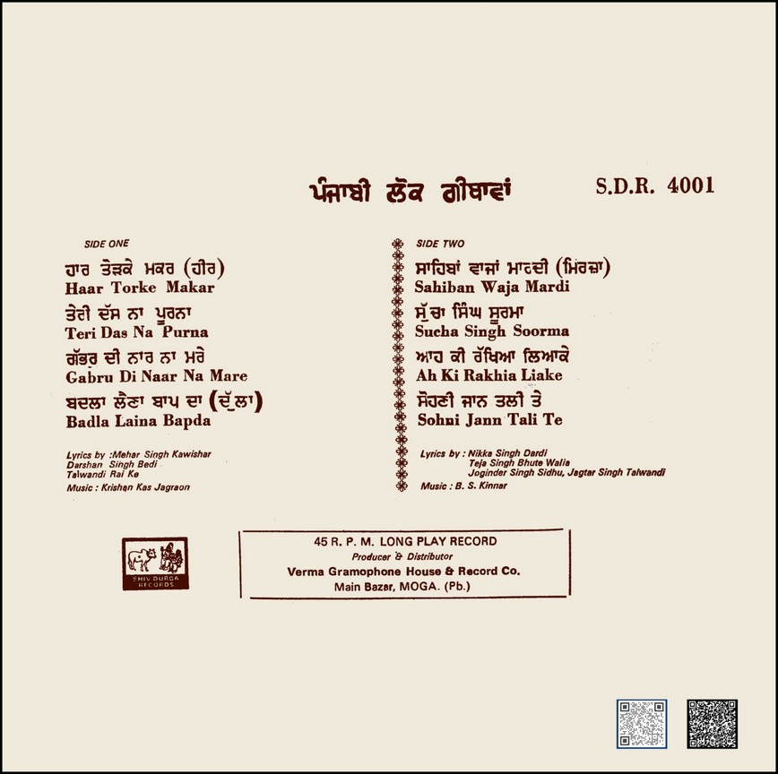 Nikka Singh Dardi & Bawa Singh Sidhu – Punjabi Lok Geethwan – SDR 4001 – (75-80%) – CR – Punjabi Folk LP Vinyl