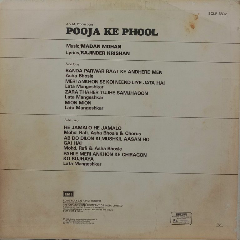 Pooja Ke Phool – ECLP 5892 – (80-85%) – Bollywood LP Vinyl