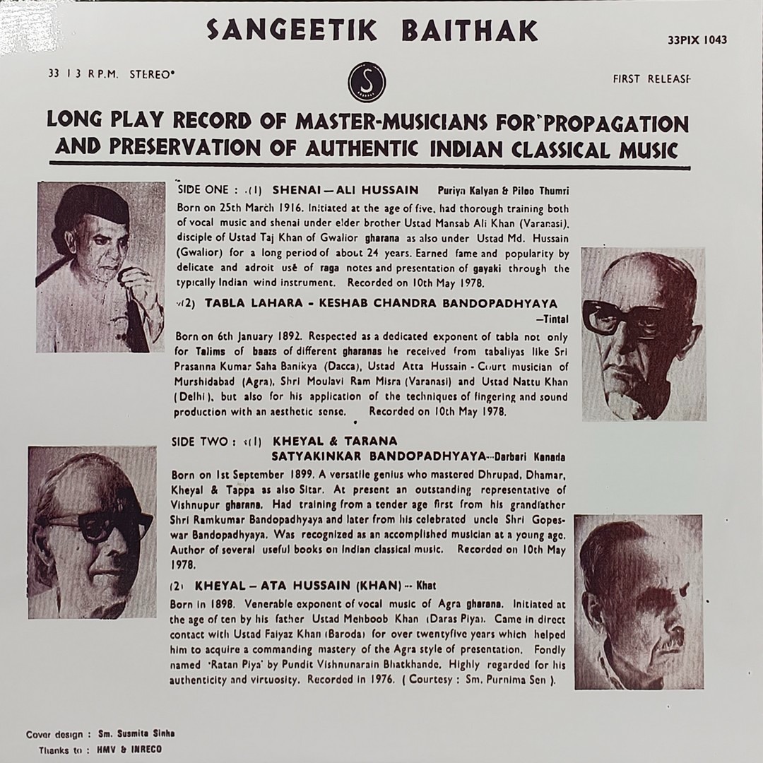 | Artist | Ali Hussain, Puri Kalyan, Piloo Thumri, Keshab Chandra Bandopadhyaya, Satyakinkar Bandopadhyaya & Hussain Khan |