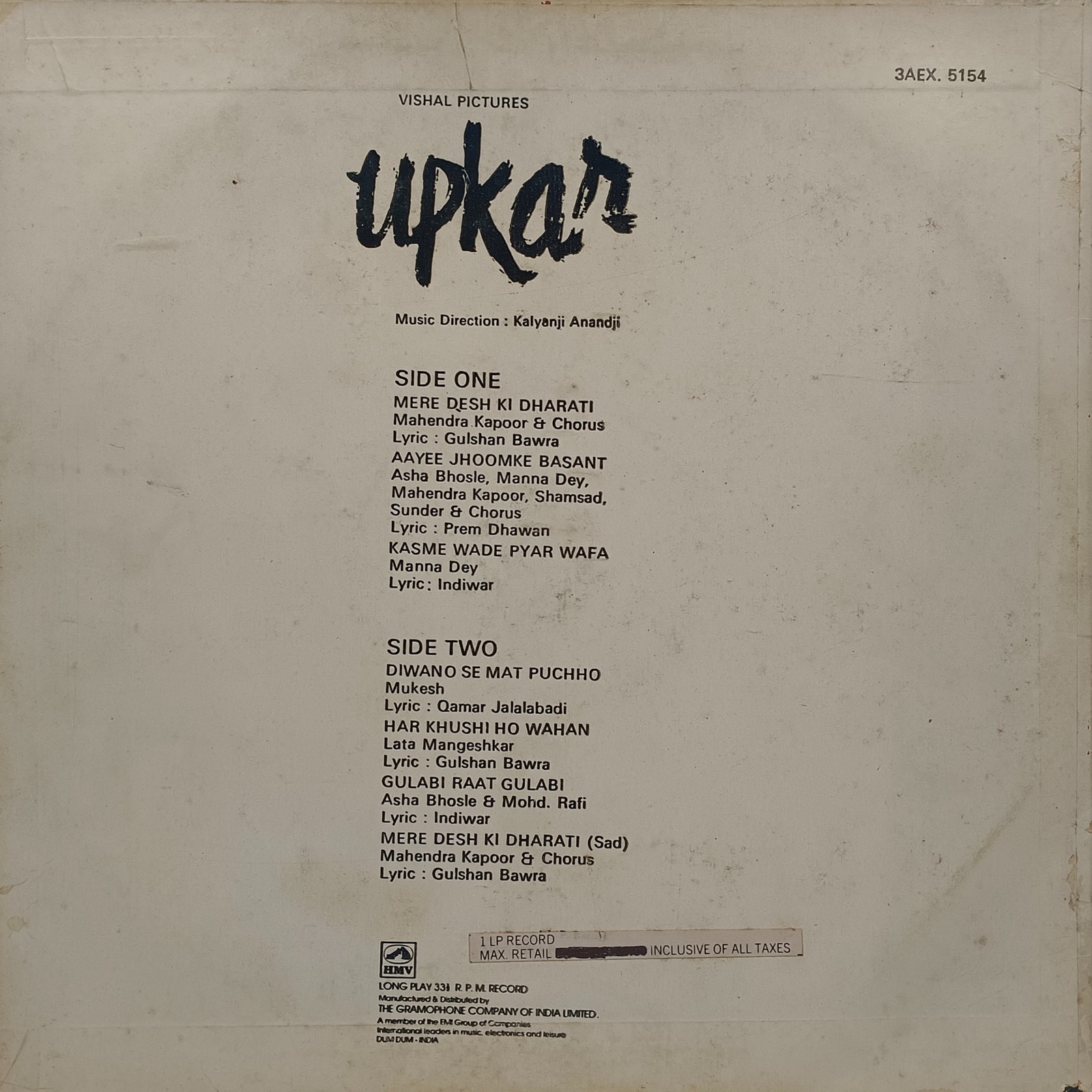 Upkar – 3AEX 5154 – (90-95%) – Bollywood LP Vinyl